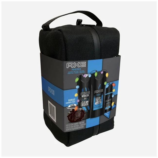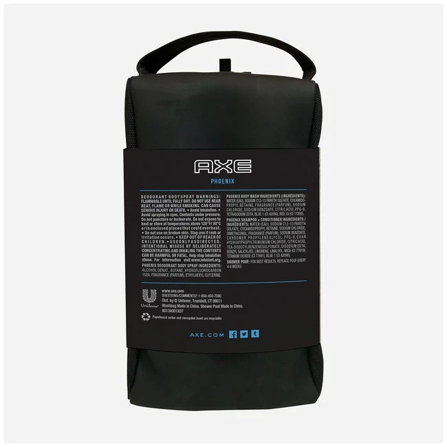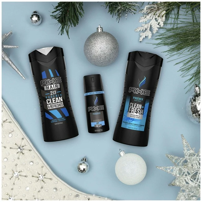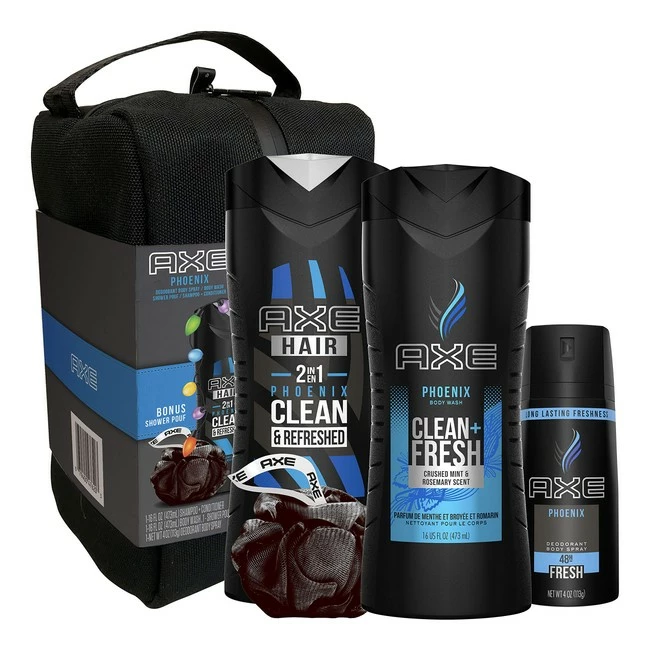 The best gift for Him. Looking for one of the perfect gift Sets for men? Or want to treat yourself? Give the gift of style with this AXE Holiday gift pack. It will help him smell ready and get out the door feeling fresh and confident. Be on top of your game for 48 hours straight with this head-turning combo of fragrances inside this AXE Phoenix shower bag gift set includes one 4 oz AXE Phoenix deodorant Body Spray, one 16 oz AXE Phoenix Body wash for men, one 16 oz AXE Phoenix hair 2-in-1 shampoo + Conditioner, with a bonus gift of a shower bag and shower pouf. Every masterpiece starts with a clean canvas so say hello to squeaky-clean freshness. Start the day by showering with invigorating AXE Phoenix Body wash. You need a men’s shampoo and conditioner that’s powerful enough to blast away the daily grime. AXE Phoenix 2-in-1 shampoo + Conditioner gives you impeccably clean, soft and irresistible to touch hair. A few quick sprays of AXE Phoenix deodorant Body Spray for Men put on the perfect finishing touch. First twist the cap and then target body and neck for a lasting great smelling fragrance that makes a lasting impression. All that is left is to get dressed and head out. All that is left is to get dressed and head out. AXE Phoenix is a classic, fruity fragrance that features notes of lavender, geranium, citrus, and coumarone. Its earthly composition and subtle blend of wood and fruit refresh the senses. AXE Gift Sets are also available for guys in Apollo, Black and dark Temptation fragrances, along with many other gift pack options. You can also pair this gift set with AXE Phoenix antiperspirant & Deodorant Stick.