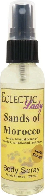 Sands of Morocco is an exotic, sensual blend of carnation, sandalwood, and musk. This fragrance is phthalate free. Our body spray adds a little bit of moisture to your skin along with a light fragrance. Our Double Strength formula contains double the fragrance of our original body sprays for people who like a stronger body spray. All of our products are made to order. To avoid leakage in transit, Eclectic Lady tapes all caps on our sprays and places each bottle into it’s very own reclosable bag.
