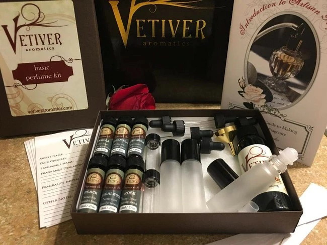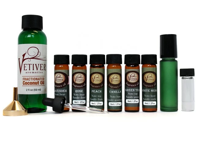Ready to create your own custom perfume? Looking for that perfect gift for a wedding, birthday, or anniversary? Well look no further! Try out Vetiver Aromatics’ Basic Perfume Kit. Our kit includes everything you need to get started in the art of perfumery. You’ll receive: 2 oz of Fractionated Coconut Oil, 1 perfumer’s funnel, 100 perfume tester strips, 2 of our clear 1 dram vials for storing blends, 3 clear frosted 10 ml roll-on bottles, 5 perfume recipe cards, 9 page Introduction to Artisan Perfume Booklet, 6 glass 2 dram screw thread droppers, 6 fragrance oils in 1/4 oz glass vials (2 dram) size. The oils included in this kit are: rose, peach, green tea, vanilla, white musk, and sandalwood. [ NOTE: In the rare case we are out of stock of the above oils, they will be swapped for a similar oil. ]
