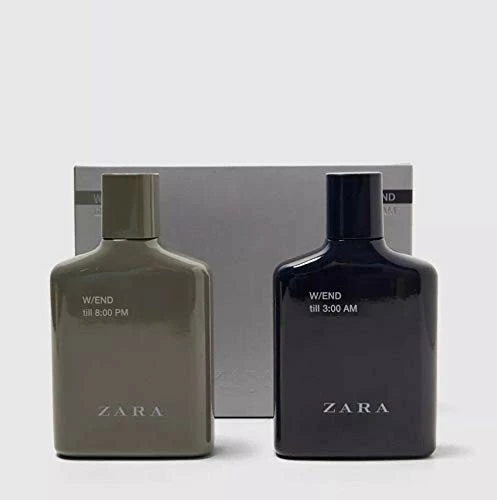 Zara W/END TILL 8.00 PM W/END TILL 3:00 AM 100 ML+100 ML 2 pack perfume Eau de toilette duo set. The scent reveals notes of tangerine, pepper and leather (I) + bergamot, pineapple and violet leaves (II).
